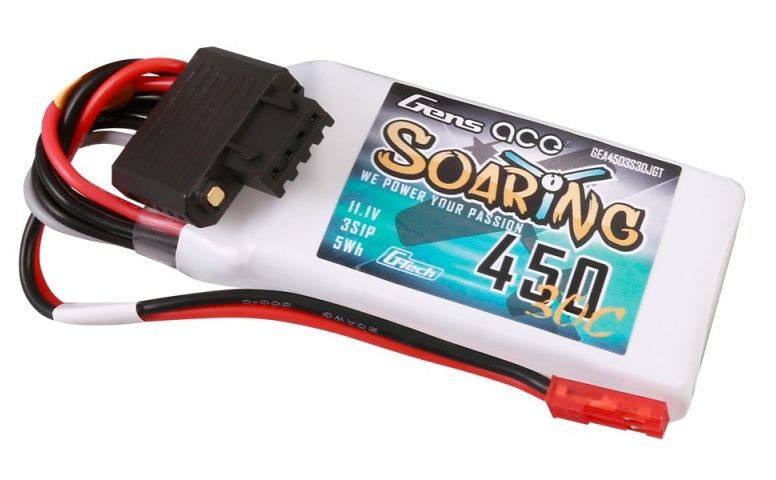 2x Gens Ace Soaring 450mAh 3S: Klasični priključek JST-SYP z balanserskim priključkom G-tech JST-XH 3S. Nizka masa in stabilna napetost skozi celoten cikel praznjenja.