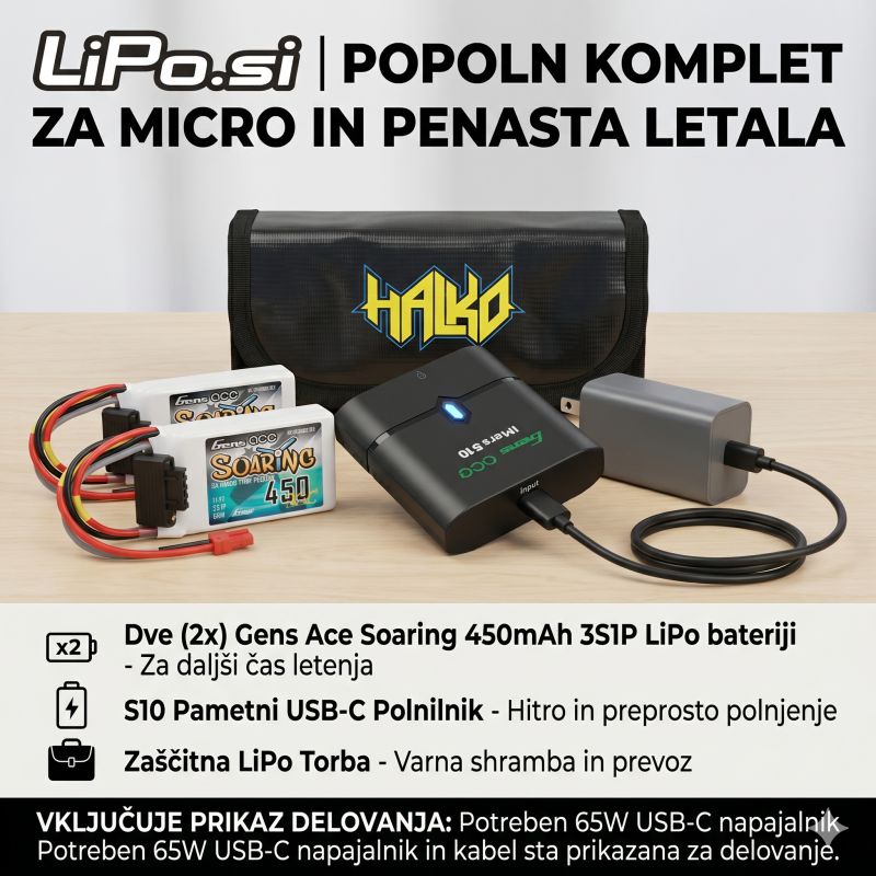 Pro nasvet: Če že imate večje LiPo pakete (npr. 4S ali 6S od večjih modelov) in bi radi te male 3S pakete polnili na terenu kar iz njih, poglejte naš USB-C modul 65W. Ta modul spremeni vašo večjo baterijo v zmogljiv “powerbank” za polnilnik S10!