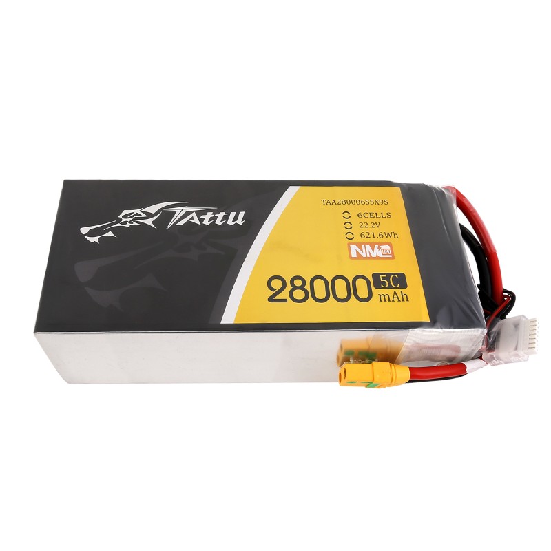 Tattu NMC 28000 mAh 22,2 V 5C 6S1P LiPo paket s priključkom XT90S je nova vrsta poltrdnega LiPo akumulatorja z visoko energijsko gostoto in dolgo življenjsko dobo. Primerna je za različne majhne in srednje velike drone, ki so običajno uporabljajo za kartiranje, inšpekcijo, geodetsko raziskovanje, dostavno industrijo, itd. Ob teh vrstah uporabe je stopnja praznjenja 1-3C.