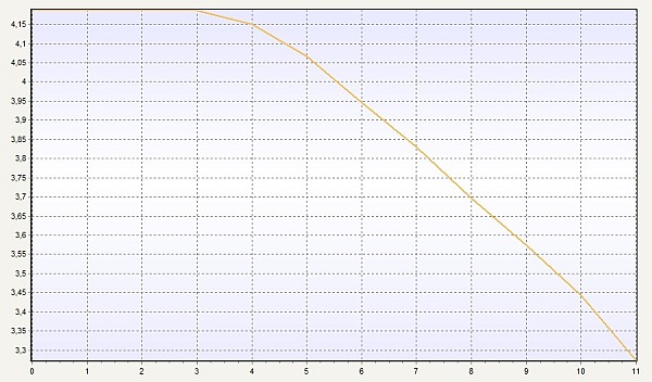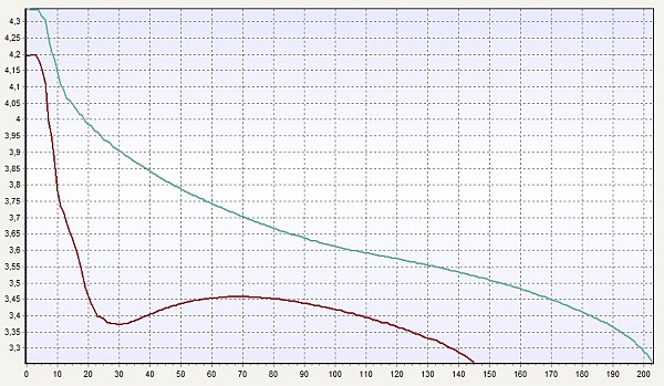 Enako primerjavo naredimo tokrat na večjem paketu serije Soaring. Ta serija je namenjena modelom, kjer so motorni časi načeloma daljši od 4 minut. Kako izgleda praznilna krivulja paketa Soaring 1000mAh 30C polnjenjega pri 1C (1A) po eni uri pri 200W trajne praznilne moči (ca 18C)? Tak paket bo imel tokovno (na nalepki) enake sposobnosti kot zgornji 450mAh 75C primer (33.75A proti 30A trajne obremenitve). Vseeno pa so rezultati popolnoma drugačni. Že leta 2012 smo v prvi brošuri zapisali: