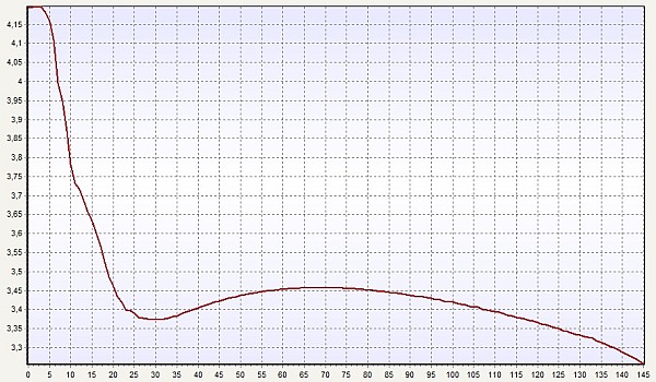 Pri “mrzlih paketih” oz. po 1C polnjenju se zna zgoditi, da bo po 30s že izklopil krmilnik (ali bo piskal piskač), saj se je napetost sesedla pod 3.4V/člen. Po 30s lahko opazujemo trend naraščanja napetosti med praznjenjem, kar je znak, da se paket segreva. Notranja upornost z višanjem temperature pada, kar povzroči, da se napetost med praznjenjem dviga. Pa vendar tako početje ne vpliva “blagodejno” na življensko dobo. Napetost pod obremenitvijo je ves čas (pre)nizka.